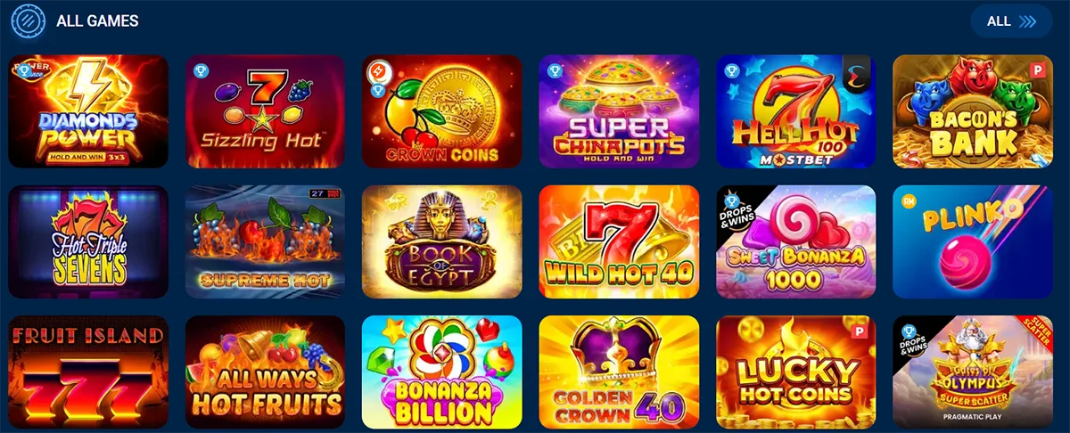 We provide access to thousands of Mostbet Casino slots from top-tier providers including Pragmatic Play, NetEnt, and Microgaming. Our slot collection features popular titles with various themes, from classic fruit machines to modern video slots with bonus rounds.